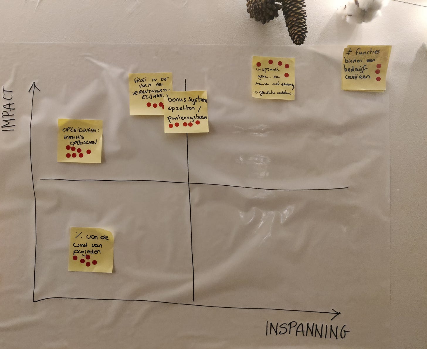 When the impact is just right you do the same way only horizontally. ‘Does this idea have higher or lower effect than where it is now?’ Another way of seeing impact is to put it on a timeframe. High effort means that it would take the team a long time until the idea is finished or started with, low effort means the contrary.