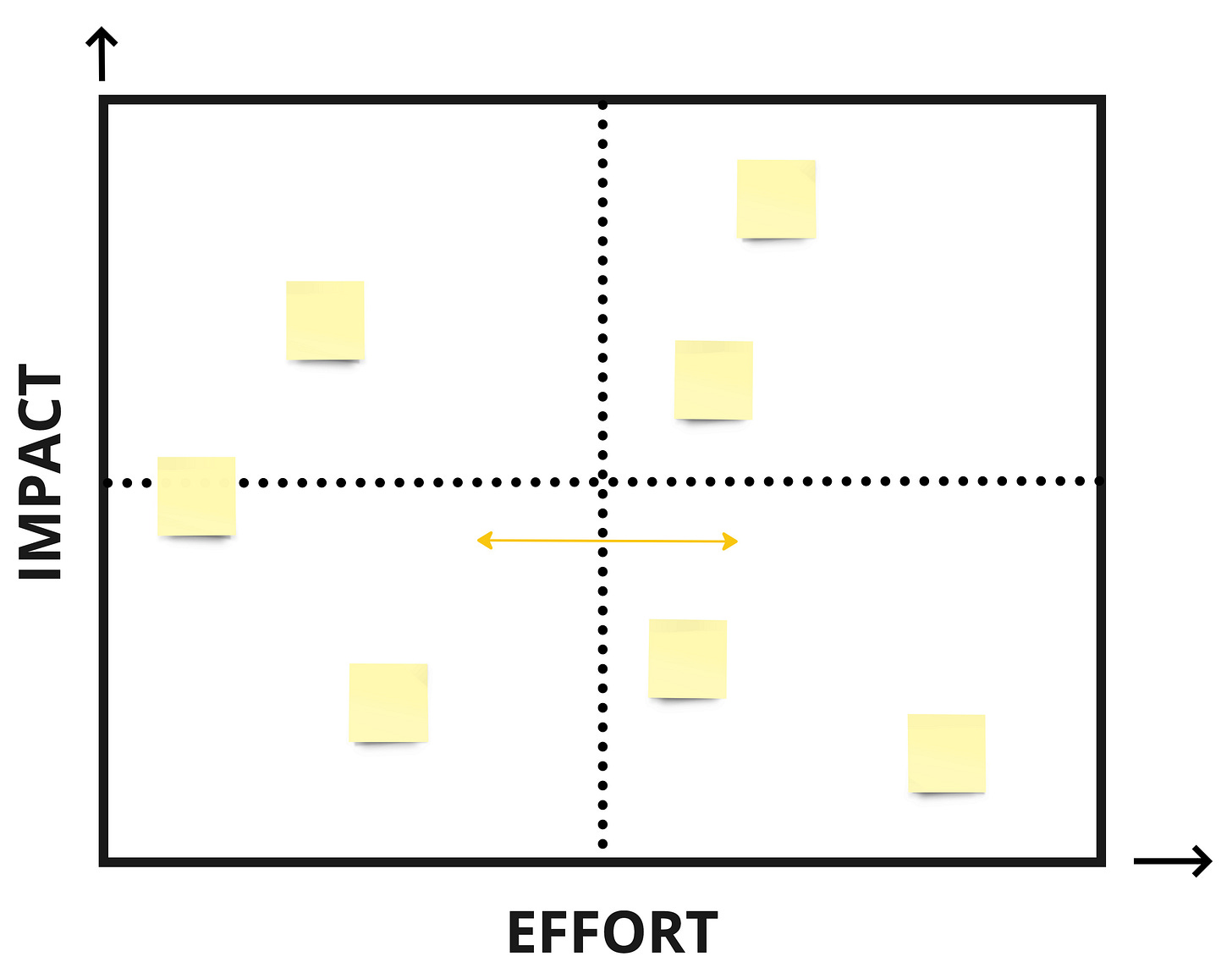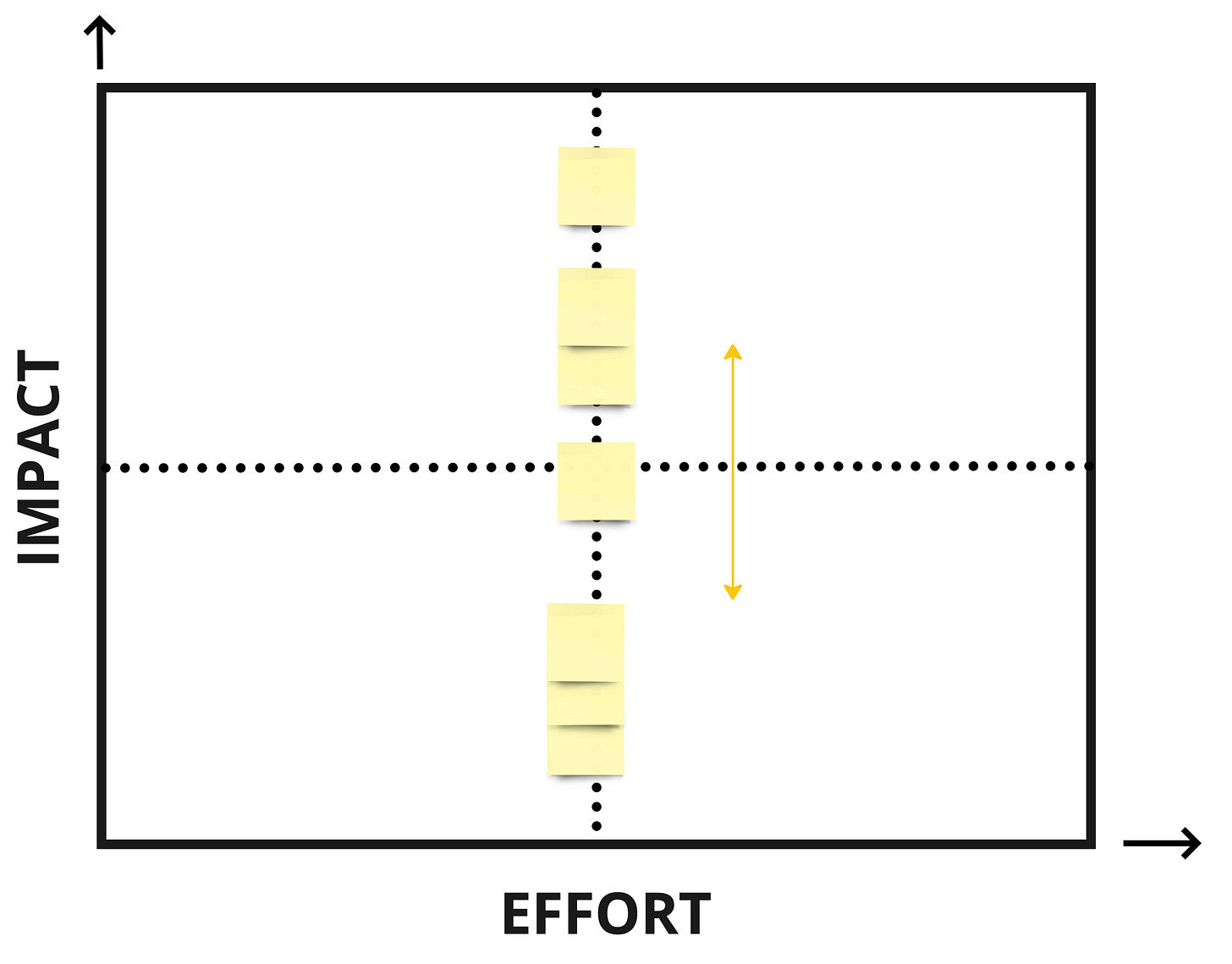 Take the 8-10 top voted ideas and start drawing the effort/ impact matrix on a whiteboard as shown below. You then pick the top voted idea and hover it right in the middle of effort and impact. Ask the participants ‘does this idea have higher or lower impact than where it is now?’ You should only go up or down on the impact axis.